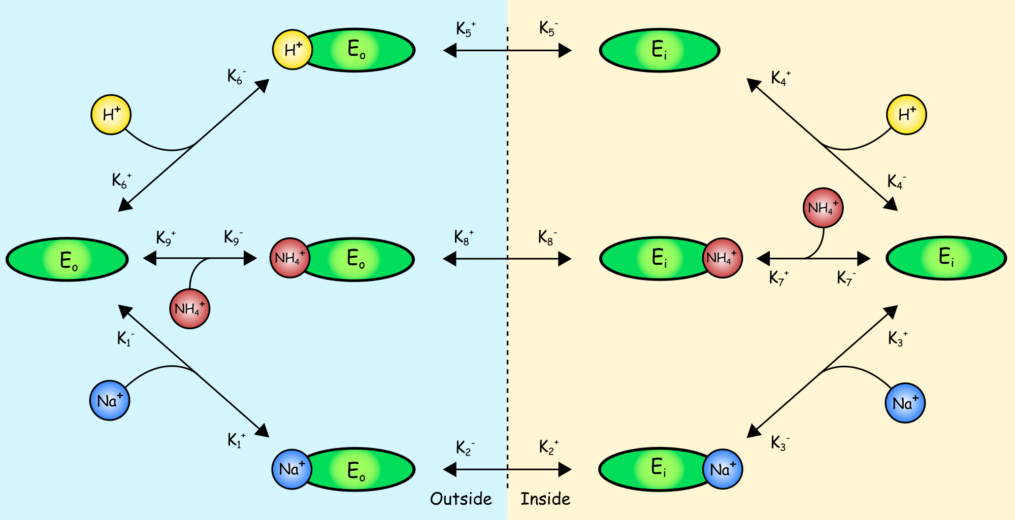 The figure above represents the kinetic scheme for NHE3. The carrier, X, can be oriented toward the external (Xext) or internal (Xint) side of the membrane and bound to one of three ions, Na+, H+, or NH4+. It is assumed that cation binding is faster than translocation of the carrier-ion complex, therefore the concentration of the loaded carrier at each side is defined by equilibrium binding constants, KNa, KH, and KNH4. The carrier is assumed to be symmetric, so the binding constants are the same for either side of the membrane. Translocation constant for the loaded carrier occurs based on rate coefficients, PNa, PH, and PNH4. Also translocation does not happen for empty carrier.