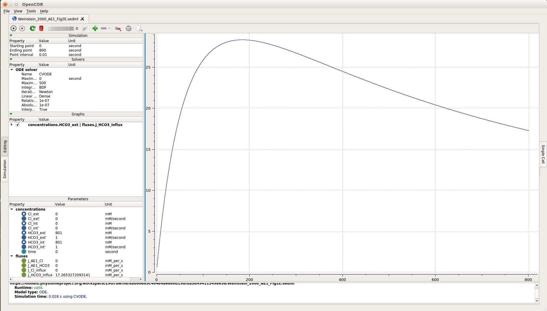 This is the general mathematical model for the AE1 model with modifications to enable simulations which are capable of reproducing Figure 2E in the original paper. See the various views available in the right hand column. The simulation experiment for this model can be obtained by loading the corresponding SED-ML document into OpenCOR and executing the simulation. The results of which are shown below. A rendering of the mathematical model itself is available here.