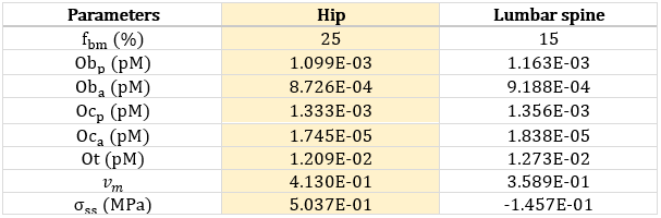 The initial values of the parameters of this CellML model have been set to represent the hip as shown in the following table.
