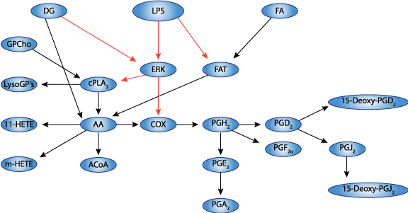 | Schematic diagram of the reaction network for LPS/ KDO2-lipid A stimulated eicosanoid metabolism and signaling pathway. |